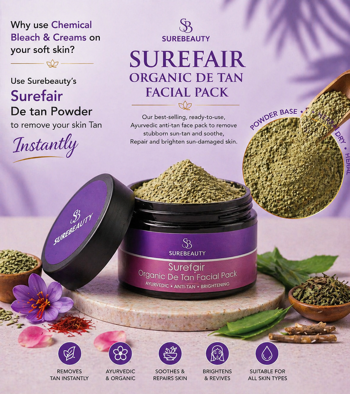 SUREBEAUTY Ayurvedic tools like facial oils, De tan pack, Cleanser … its gently nourish your skin, cleanse the pores and help the skin breathe better.